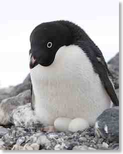 Initially, male and female fast together during a courtship that takes about 12 days. Males return to nests they occupied in previous seasons; their nests being little more than scraped depressions in the frozen earth which they line with stones. Returning females choose a partner from those males occupying nests. Females show a preference for their former partners, but as more than a quarter will have died during the dark days of winter, and perhaps as many again will arrive at the rookery after them, most often female Adélie penguins must choose new partners. Time for breeding in the short Antarctic summer is extremely limited: it does not pay females to wait for late lovers, no matter how good they might have been. Few chicks fledge from late eggs.